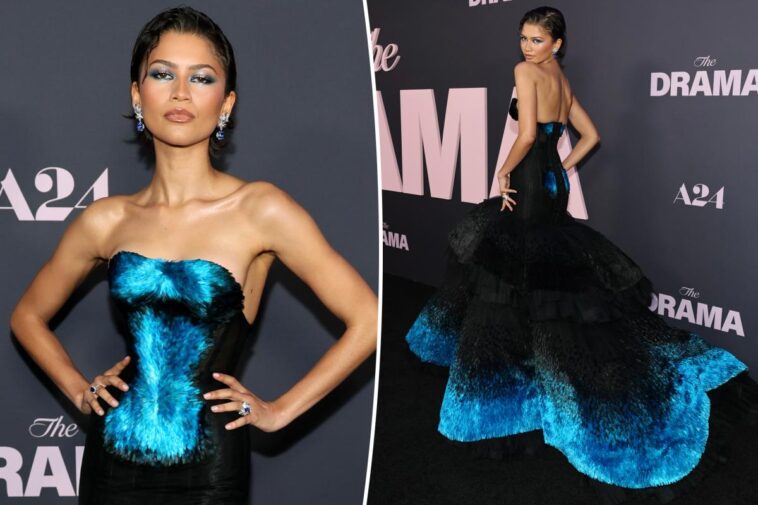 Zendaya arrived at the New York City premiere of “The Drama” on Thursday night in a strapless black and blue feathered gown from Schiaparelli Haute Couture, completing the bridal tradition she and longtime stylist Law Roach have been threading through her press tour for the film.
